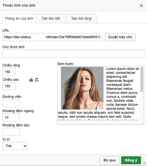 Tada! Đã hiển thị full đường dẫn đến file ảnh luôn, giờ chỉ cần set các thuộc tính hình ảnh nếu cần rồi bấm Đồng ý là ảnh của bạn đã được chèn vào editor thành công rồi đó!